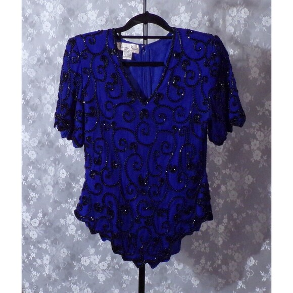 Vintage 80s Silk Blouse 1980s Royal Blue & Black Beaded Art Deco Goth Size Small