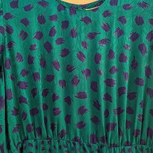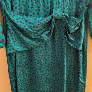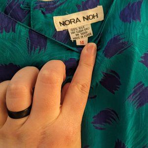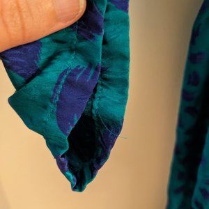 If you want a very 80s dress look no further. 100% silk dress by Nora Noh. Very poppin' shoulder pads if that's your thing (or they look easy to remove by cutting a few stitches if it's not!). The back has both a zipper and buttons, and the front has sort of a sash type piece that's intended more decorative than functional. I'd call this color turquoise - it can look either more blue or more green depending on lighting.