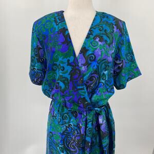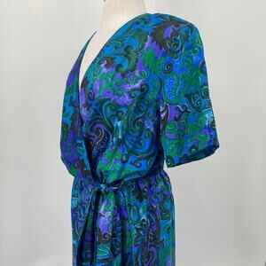 Keywords: vtg retro 1980s eighties 1970s seventies 70s 1990s nineties 90s colorful vibrant bold chic classy classic wrapdress elegant sophisticated feminine silky lightweight artsy artistic floral paisley geometric geo pattern patterned print cobalt blue purple silky western flattering blouson fit and flare sundress tie waist scarf