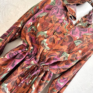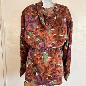 This vintage 80s boho silk hoodie in size Large features a unique multicolor floral pattern, button up with long casual sleeves. The shirt is oversized, lightweight, and breathable, making it suitable for all seasons. It has light shoulder pads, adjustable pull waist and side pockets for added functionality. The brand is Silk Plus, hooded tunic style. It has a retro 80s boho-chic vibe.