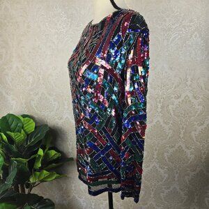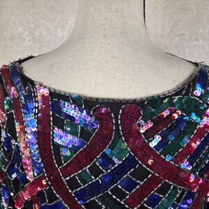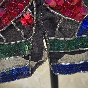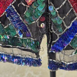 Blue, green and fuchsia sequins outlined with clear beads on a black silk background. Modest neckline. Long sleeves. Side vents have been cut that are not original to the design. This would pair easily with black trousers or a slim skirt.