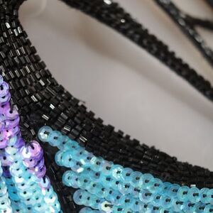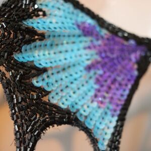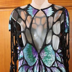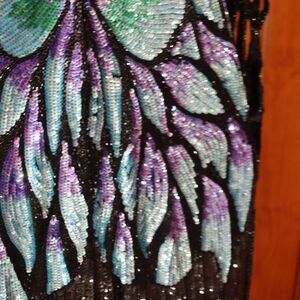 Vintage 80s Silk Sequin Peacock Butterfly Evening Gown Maxi Dress