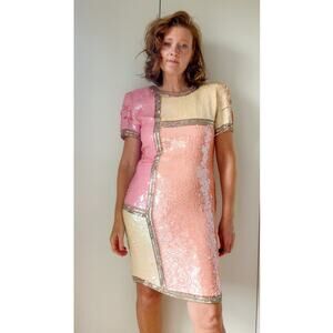 Vintage 80s Silk Sequin Pink Cocktail Dress Medium Fit Knee Length Sparkle Shine