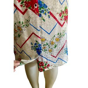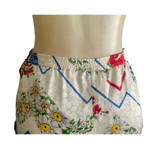 This skirt features a shiny silk fabric with a floral design in primary colors, and shiny reflective white leaves all over the print. It has a underskirt as well.