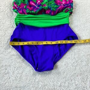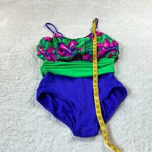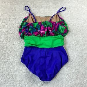 Fun 80s swimsuit in bright purple, green, and pink. Features a wide waist and blousy top. Bust is not lined, and straps do not adjust.