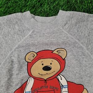 Vintage 80s skater teddy-bear sweatshirt with a baggy cropped fit. Gray raglan style with a bold graphic. Cozy and nostalgic shop now!