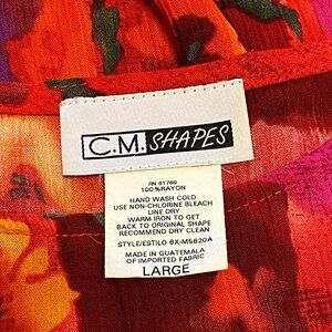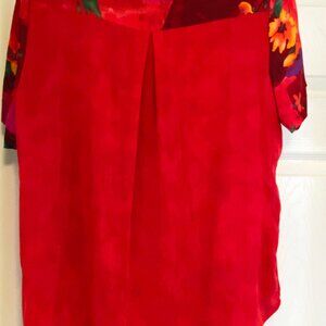 The coolest thing about this dress is that it has a 23" long button-up side slit along the left side, so you can button or unbutton to show as much leg as you like! Predominantly red, with blocks and flowers of pink, burgundy, orange, and yellow. It's soft, comfortable, and flowing. 100% rayon, hand wash only.