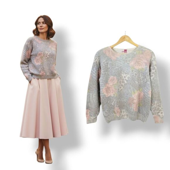 Vintage 80s Soft Silk and Angora Knit Blend Floral Animal Print Sweater Size M
