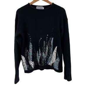 Vintage 80s Sparkly Angora Black Sweater Abstract Sequins M Metallic Retro