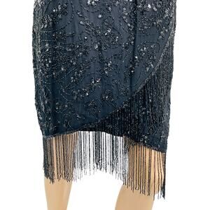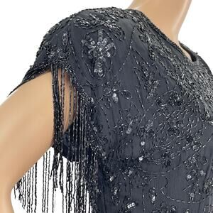 Vintage 80s Stenay Black Silk Bead Fringe 20s Flapper Elegant Cocktail Dress 6
