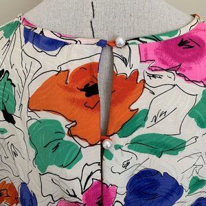 Vintage 80s Stracci Newport Beach custom made vibrant colorful silk floral print top and skirt set. The skirt has a drape front and zips up the back. About a size medium but check measurements for fit as this was custom made. Excellent condition.
