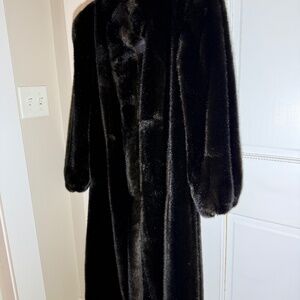 Luscious dark brown chocolate faux fur long coat. Luxurious and timeless piece. Feels like real mink and just as warm. Dark brown satin lining. Two slit side pockets. Attractive large button neck closure with disappearing hook and eyes down its length.Style VI Ltd sold at Flemington Furs. Made with great attention to detail using top-quality materials.