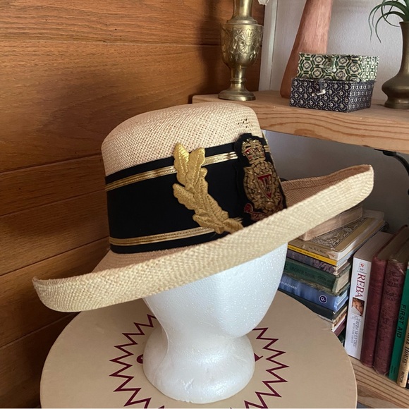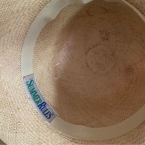 Vintage 80s Summer Rules nautical crest logo straw hat. Scotland nautical crest logo band. Summer Rules brand. Great used condition. Approximately 23 inch circumference head opening and 14 inch diameter.