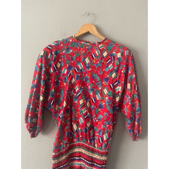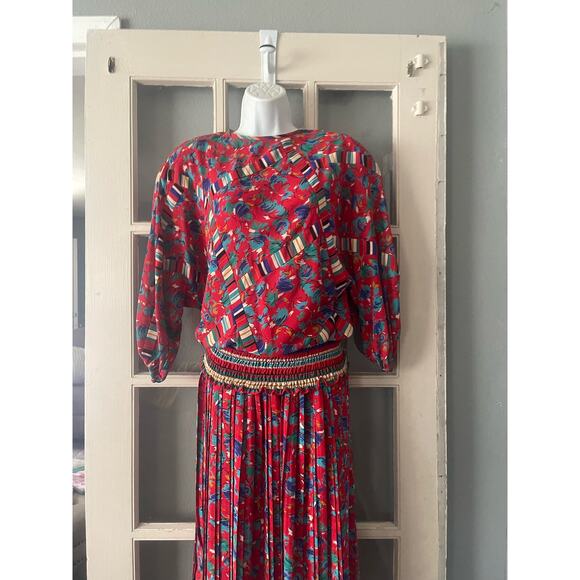 Vintage 80s Susan Freis Dress Floral Stripe Shoulder Pad Pleated Skirt Outfit