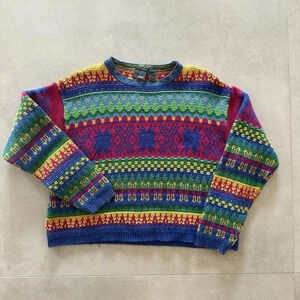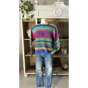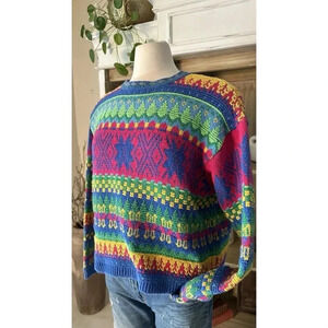Vintage 80s Sweate Colorful Geometric Fair Isle Knit Pullover Bold Retro