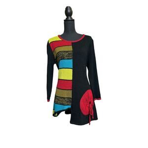 American vintage 80's sweater / tunic with bright abstract color. The front is asymmetrical on one side with the top being 4" up. There is a 7" pocket across bottom front that has pull string tie. The back has colorful stripes on one side. The brand is Ronnie Salloway in a US size Large. There is some fuzzing due to age please see pics. If outside of US please message me for exact pricing. All measurements are approximate flat measurements.