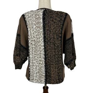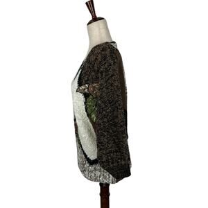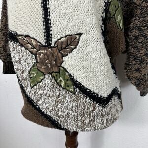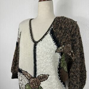 Vintage 80s Sweater Top Women Medium Brown Cream Mixed Media Floral Unique