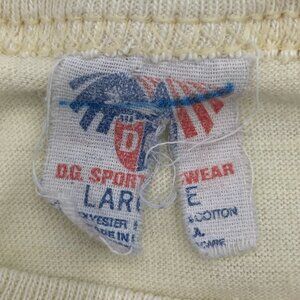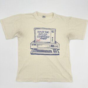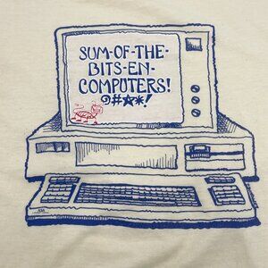 Vintage D.G. Sportswear short sleeve t-shirt with retro computer humor - a grinning bug and a computer with "Sum-Of-The-Bits-En-Computers!" on the screen. Off-white/cream color. Single stitch hem.