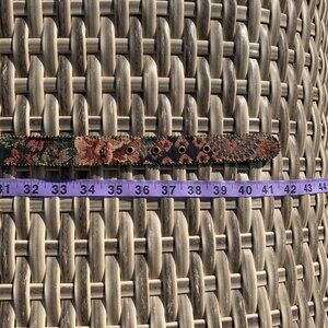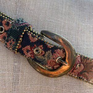 This Vintage 80s Tapestry Waist Belt in XL size features a colorful floral pattern, perfect for women who love a hippie, boho chic style. The belt is made of fabric with a brass buckle hardware accent. It has a normal width and is adjustable, making it comfortable for a waist size of 35-38 inches. This piece is ideal for those who appreciate a retro, nature-inspired, and romantic aesthetic, adding a touch of cottagecore prairiecore charm to any outfit. Made in the United States, this belt embodies a unique blend of granny chic, rose, and western themes.