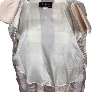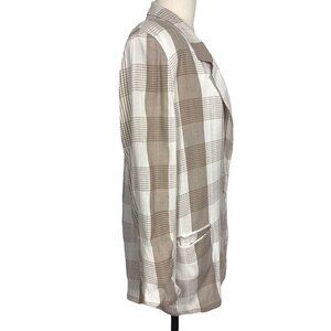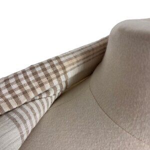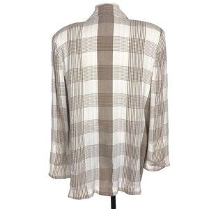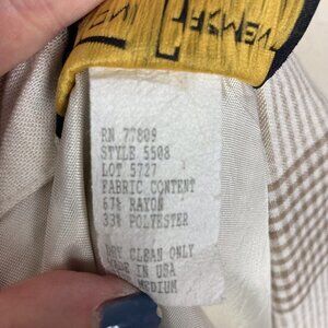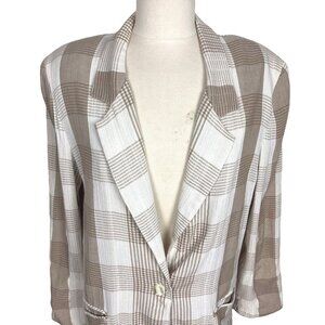 Beige and white plaid. Single button front. Pockets. Shoulder pads. 67% rayon/33% polyester. Size M.