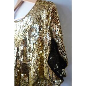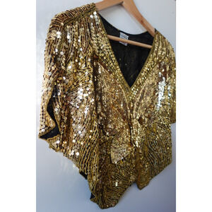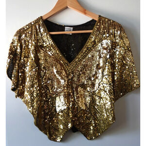 Vintage 1970's- 1980's -Womens Pure Silk Sequin Butterfly Top - Size M/L - Gold - 100% Silk - Beaded - Embroidered - Sequins- Sparkly - Disco- Fairy - Whimsical - Dance- Cocktail Party - Festive - Feminine - Party Top- Cropped - Dolman Sleeve - Sexy - Chic- Boho- Bohemian - Vegas- Glam - Goddess