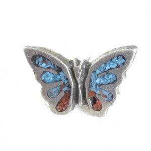 • Blue turquoise, and red coral, natural stone, chip inlay design on the wings.
