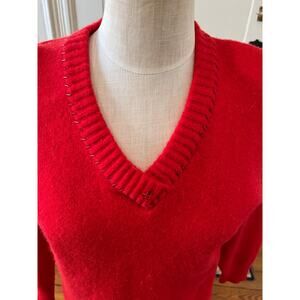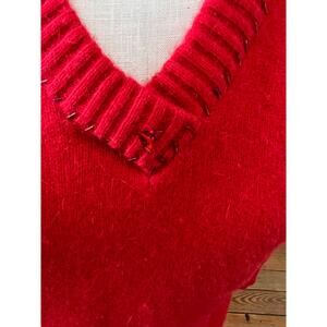 Vintage 80s Two Man Knitwear Red Angora Blend Fuzzy Sweater, no size but approximately a Small. Good preowned condition with a spot noted on the back of sleeve. V Neck with beading detail, ribbed cuffs and hem, shoulder pads. No materials tag