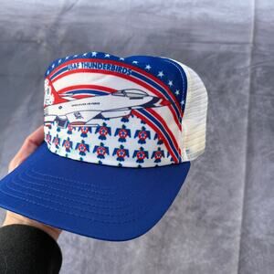Vintage 80's USAF US Air Force Thunderbirds White Blue Trucker Snapback Hat Cap VTG Retro. The hat is in very good vintage condition. Has a great shape and fit. Will be shipped in a box. See photos for extra details. Feel free to message me with any questions.