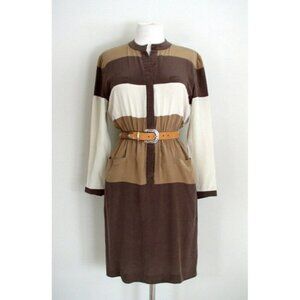 Vintage 1980's Umi Collections by Anne Crimmins shades of mocha colorblock silk shirt dress. A beautiful dress with hidden button placket. Elastic waist. Four pockets.