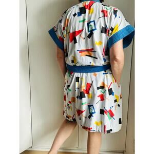 Add a splash of retro charm to your loungewear with this Vintage 1980s terry cloth robe in a bold geometric print. Soft, cozy, and delightfully quirky, this unisex style fits a Medium and brings that playful ’80s vibe to mornings, spa days, or lounging at home. Features classic wrap styling and absorbent terry texture for comfort and personality in one easy piece.