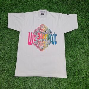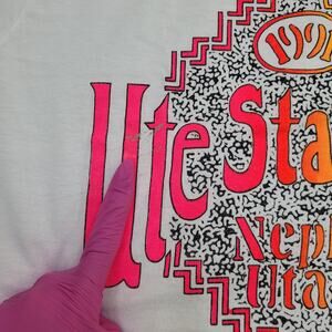 Celebrate the spirit of the West with this vintage 80s Ute Stampede rodeo shirt. Bold neon graphics and classic style from Nephi, Utah.
