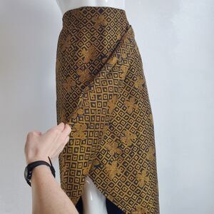 Vintage 80's Valerie Stevens gold and black tulip midi skirt with leaf grid pattern. Has partial elastic waistband, front-pleating, tulip-style wrap skirt, and black lining.