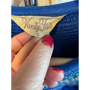This Vintage 80s Vanity Fair Maxi Robe is a standout piece in royal blue, featuring a full zip and an embroidered collar. Its large size ensures a comfortable fit.