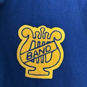 This vintage early 80's Cape Collar Hooded Varsity Band Jacket in blue and gold is a stylish addition to any wardrobe. Made of wool with a mid-length cut, this jacket features a snap closure, zippered accents, and a hood for added warmth. The classic sailor collar and Varsity Jacket style give it a retro 80's vibe, perfect for casual occasions. This unisex jacket in size L from Fordham is a unique piece that combines nostalgia with modern style.