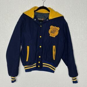 Vintage 80’s Varsity Jacket Wool Cape Collar Split Hood Band Blue Gold Size L