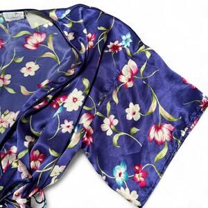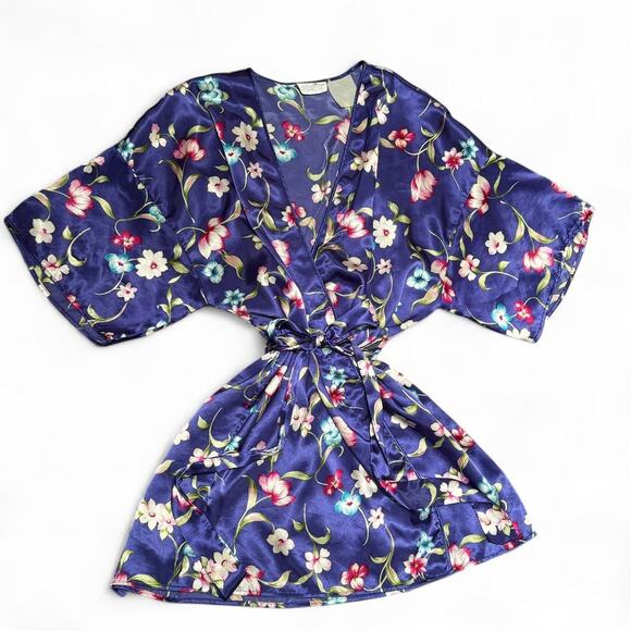 Gorgeous vintage Vassarette satin floral robe in deep indigo blue with pink, white, and blue flowers. Soft, silky feel. Kimono style with wide sleeves and tie belt.