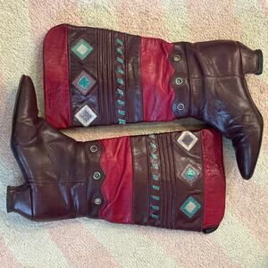 Vintage 80s Vita Mori Burgundy Geometric Western Revival Art Deco Leather Boots