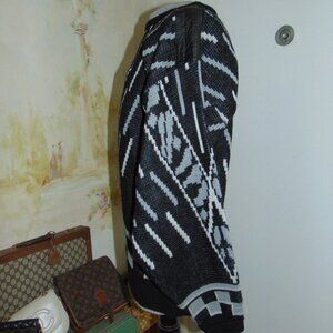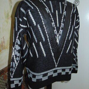 Vintage 80s Wayne Scott Sweater Men's Hand Knit Leather Black White & Gray Retro Large