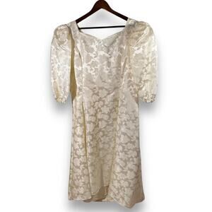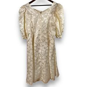 Beautiful vintage wedding dress in ivory jacquard, size 22. Classic puff sleeve design with sweetheart neckline and midi length. In excellent condition—perfect for ceremonies, elopements, or bridal portraits. Just $135 with Best Offer encouraged—so that you can make it yours today.