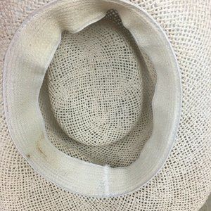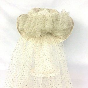 Veil with gold glitter. Measures 8” inside hat, 141/2” front to back and 13” wide. Veil is starting to detach a little from the hat, so may need to be re-glued in certain areas. Veil is approximately 32” long from brim of hat. Has a blemish inside the hat. Please see pics.
