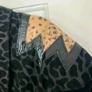 This rare vintage 80s West Bay Sport Leathers jacket is a bold statement piece crafted from 100% genuine leather. Featuring striking animal print lapels and shoulder accents, it blends retro, Western, and edgy fashion effortlessly. The unique leopard-print detailing, along with gold-tone buttons, adds a touch of flair. Made in Korea, this jacket showcases exceptional vintage craftsmanship.