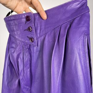 Standout vintage leather pants from West Bay Sport Leathers, crafted in soft 100% lamb napa leather. Bold purple hue with a dramatic high-rise waist, angled 3-button closure, and pleated front for a true 1980s–early 90s silhouette. Tapered leg cut with side pockets, fully lined in acetate for comfort. Amazing pants!!