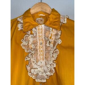 VTG eighties. Size womens 38, would fit womens medium, see measurements. Ruffle detail on bust and cuffs. Collared. Marigold mustard yellow. Great preowned condition with normal signs of wear for age. Professional, highly rated seller, quick shipper, open to offers!