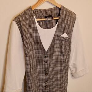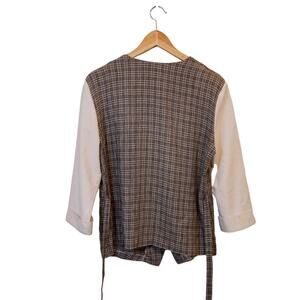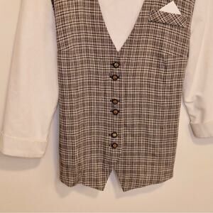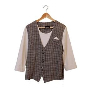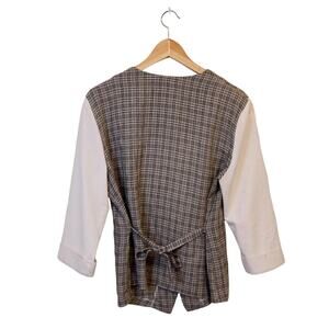White faux undershirt with an attached plaid vest that ties at the back for a corseted, fitted look. Six buttons in the front, and light shoulder pads attached. Size is tagged 10P.
