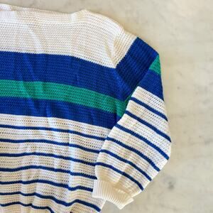Vintage 80s White, Blue and Teal Striped Boatneck 3/4 Sleeve Sheer Sweater / M L