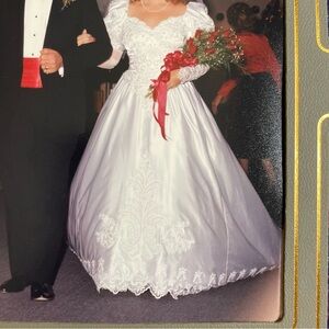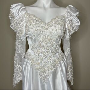 Elegant vintage wedding dress. Intricate lace details. Pearl and sequin embellishments. Puffy sleeves. Classic and timeless.