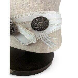 Vintage 80s Wht Leather Western Concho Fringe Belt Size M Boho Coastal Cowgirl