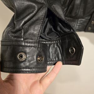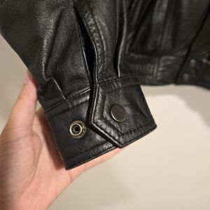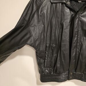 True vintage 80s Leather by Wilsons, Wilsons Leather Motorcycle Jacket. Black Leather. Collared. Full zip with snap buttons.