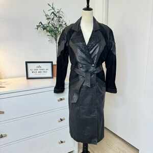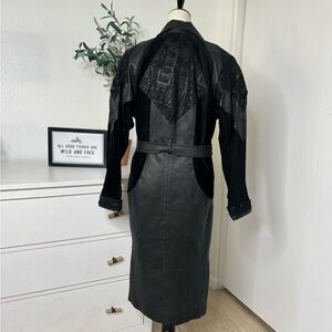 Vintage 80s long black embroidered and patterned leather/suede coat by Wilsons Leather. Size XSmall, but can fit up to size medium , please check the measurements listed below. Removable Thinsulate lining, thermal insulation. Shoulder pads. Two pockets.