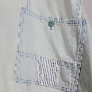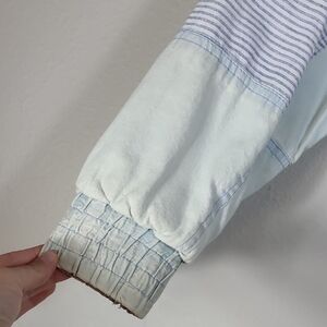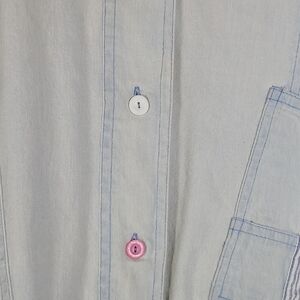 100% cotton denim bomber jacket in a faded acid wash with colorful buttons and patchwork details. Super soft, fully lined, oversized 80s/90s fit. Minor wash wear consistent with vintage look. Smoke and pet free home.